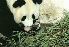 Панды появляются на свет слепыми, почти голыми и весят не больше 150 г. Первые три недели самка почти все время сидит, не выпуская малыша из передних лап и прижимая чадо к соскам. Детеныш быстро растет. К концу первого месяца у него отрастает мех с черными отметинами, а спустя еще две недели открываются глаза. Ходить он начинает только с трех месяцев, а до того мамаша постоянно носит его на себе.