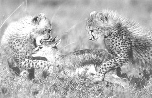 Как и все котята, детеныши гепарда рождаются слепыми, слабо держатся на ногах. Их детские мордочки напоминают маленьких старичков, тем более что ушки у них в это время плотно прижаты к голове. Со временем движения становятся все более точными, и когда они отвешивают друг другу оплеухи, то уже довольно метко бьют своими мягкими лапками. Но добывать себе пропитание они смогут лишь год спустя. Пока же мать должна научить их охотиться.