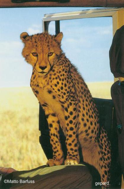 Новый пассажир. Гепардик внтури джипа.
